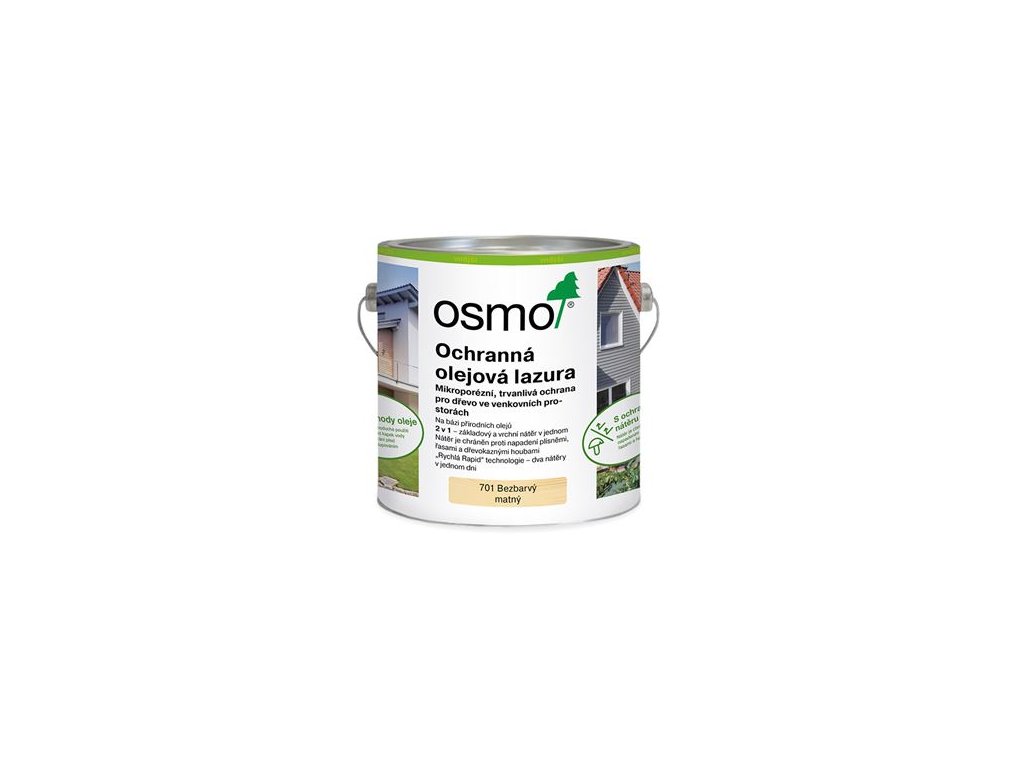 Penetrace a lazura sjednocená v jednom nátěru – inovativní dlouhodobá ochrana dřeva na bázi oleje! Ochranná olejová lazura je transparentní, polomatná a určená k použití venku. Mikroporézní, trvanlivá ochrana pro dřevo ve venkovních prostorách. Popis výrobku: Osmo Ochranná olejová lazura je matný ochranný vrchní nátěr na olejové bázi pro dřevěné prvky v exteriéru. Mikroporézní a prodyšný svrchní nátěr umožňuje dřevu dýchat a snižuje nebezpečí bobtnání a smršťování dřeva. Odolný vůči vodě i nepříznivým povětrnostním podmínkám. Obsahuje aktivní složky pro ochranu vrchního nátěru před řasami a napadením plísněmi. Ochranná olejová lazura č. 701 je matný samostatný nátěr pro svislé chráněné venkovní konstrukce jako jsou střešní podhledy, přístřešky na auta nebo opláštění budov. Osmo Ochranná olejová lazura 701 bezbarvá neposkytuje žádnou ochranu proti UV záření, a proto není doporučována pro aplikace na přímém slunci. Je taktéž vhodná jako bezbarvý, matný vrchní nátěr (pouze pro svislé plochy) na barevné Osmo venkovní vrchní nátěry jako jsou Osmo Selská barva, Osmo Ochranná olejová lazura nebo Osmo Jednorázová lazura HS plus. Docílíte tím dodatečného přírodního matného vzhledu povrchu. Doporučuje se pro: Pro svislé chráněné venkovní konstrukce: střešní podhledy, přístřešky na auta nebo opláštění budov. Počet nátěrů: U dřeva bez povrchové úpravy dva nátěry, v případě renovace stačí zpravidla jeden nátěr na očištěný povrch – bez obrušování! 1 litr stačí při jednom nátěru na cca 26 m2 POZNÁMKA K AKCI: Sleva bude automaticky odečtena z maloobchodní ceny a je platná pro veškerý prodej v ČR. Výše velkoobchodních slev zůstává nedotčena. Akce je určena pro maloobchodní i velkoobchodní prodej.Doplňkové parametry