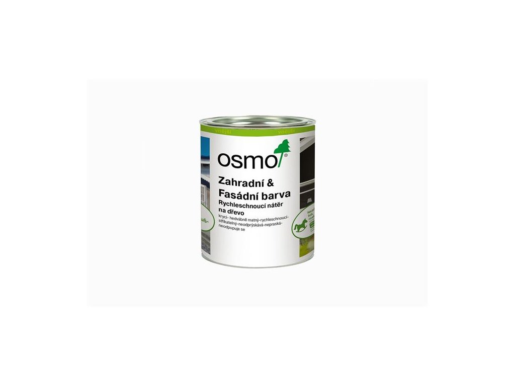 Venkovním povětrnostním podmínkám a UV- záření odolný krycí nátěr na dřevo pro venkovní použití. Osmo Zahradní a fasádní barva je prodyšná a odolná vůči vodě. Uschlý nátěr je nezávadný pro lidi, zvířata a rostliny. Osmo Zahradní a Fasádní barva je vhodná pro ošetření jakéhokoliv dřeva ve venkovním prostředí: dřevěných fasád, balkónů, dřevěných okenic, plotů, zahradních domků, zahradního nábytku, parkovacích přístřešků apod. Počet nátěrů: u dřeva bez povrchové úpravy dva nátěry. První nátěr naneste v tenké vrstvě ve směru vláken dřeva a důkladně rozetřete pomocí Osmo plochého štětce nebo Osmo válečku z mikrovlákna, popřípadě naneste nástřikem. Ponechte schnout při dobrém větrání po dobu 3 – 4 hodiny. Poté zaschnutý povrch přebruste a proveďte druhý nátěr v tenké vrstvě. Při renovacích postačí zpravidla jeden nátěr. 1 litr výrobku vystačí při jednom nátěru na cca 16 m2. Vydatnost závisí do značné míry na stavu dřeva. Uvedené hodnoty se vztahují na hladké hoblované/broušené dřevěné povrchy, u ostatních povrchů se může vydatnost odlišovat.Doplňkové parametry