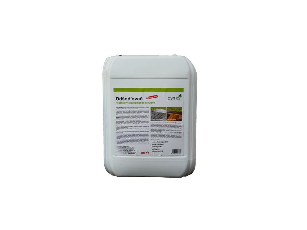 Osmo Odstraňovač šedi ze dřeva – účinný gel je hustý speciální čistící prostředek k oživení a čištění zešedlého dřeva ve vnějších prostorách. Odstraňovač šedi ze dřeva – účinný gel je husté konzistence, a proto nestéká a neodkapává, takže i na svislých plochách ho lze snadno roztírat. Gel působí do hloubky a tím se odstraní šedá patina a následným nánosem oleje se obnoví teplý barevný odstín dřeva. Obzvláště lze doporučit na dřevěné paluby, terasy, dřevěné fasády, zahradní nábytek a obdobné plochy. Na exotických dřevinách má vzhledem k vysoké hustotě dřeva daleko vyšší účinnost než u jehličnatých dřevin.Doplňkové parametry
