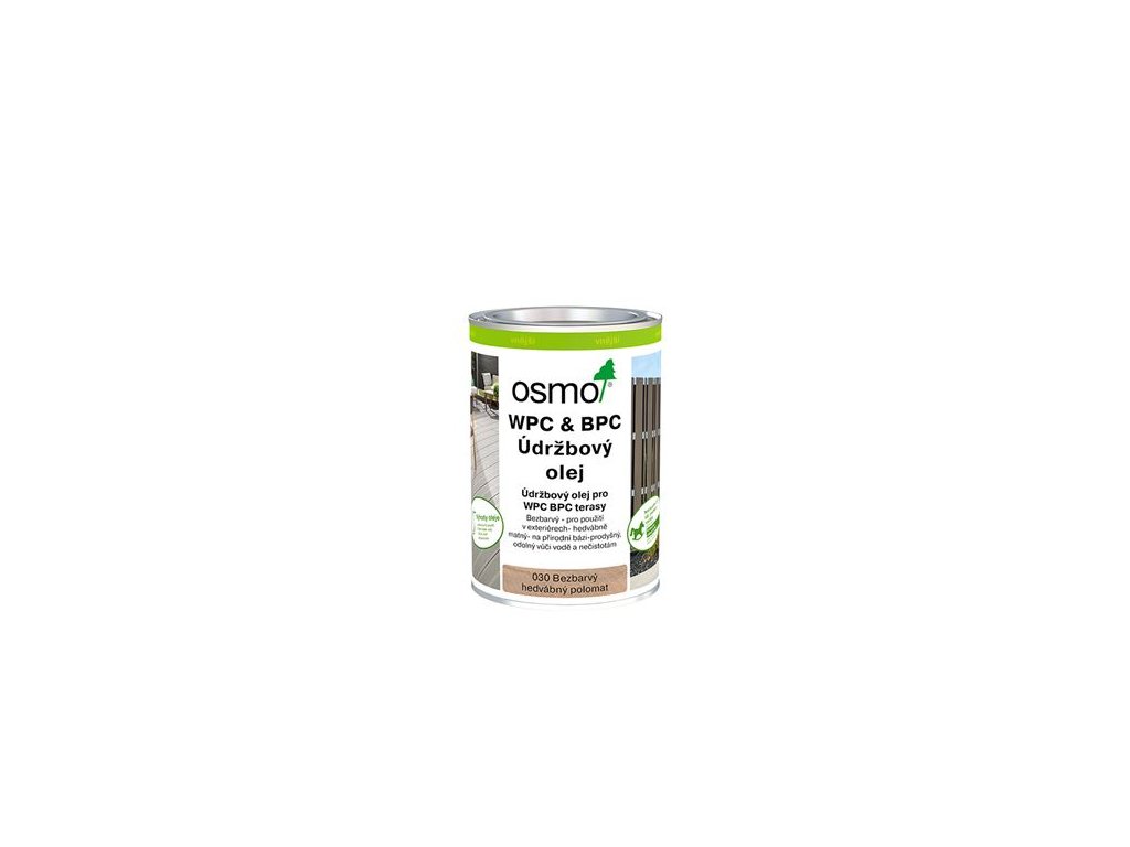 Osmo WPC & BPC údržbový olej je bezbarvý, hedvábně matný údržbový olej, který se vsakuje do dřeva a nevytváří na povrchu žádný film. Díky této impregnaci se ošetřené dřevo stává vodoodpudivým a zvyšuje se jeho odolnost proti tvorbě skvrn a znečištění. Doporučené použití: Osmo WPC & BPC ochranný olej je vhodný pro ošetření výrobků z kompozitních materiálu typu dřevo-polymer (WPC) a bambus–polymer (BPC), které již byly vystaveny povětrnostním vlivům. Je zvláště vhodný k ošetření terasových podlah, okenic a zahradního nábytku vyrobených z WPC nebo BPC materiálů. Zpracování/aplikace: Nátěr naneste v tenké vrstvě ve směru vláken dřeva a důkladně rozetřete pomocí Osmo plochého štětce nebo Osmo štětce na podlahy. Ponechte schnout při dobrém větrání po dobu 8 – 10 hodin. Vydatnost: 1 l výrobku vystačí při jednom nátěru na cca 40 m2. Vydatnost závisí do značné míry na charakteristikách dřeva. Uvedené hodnoty se vztahují na hladké hoblované/broušené dřevěné povrchy, u ostatních povrchů se může vydatnost odlišovat.Doplňkové parametry