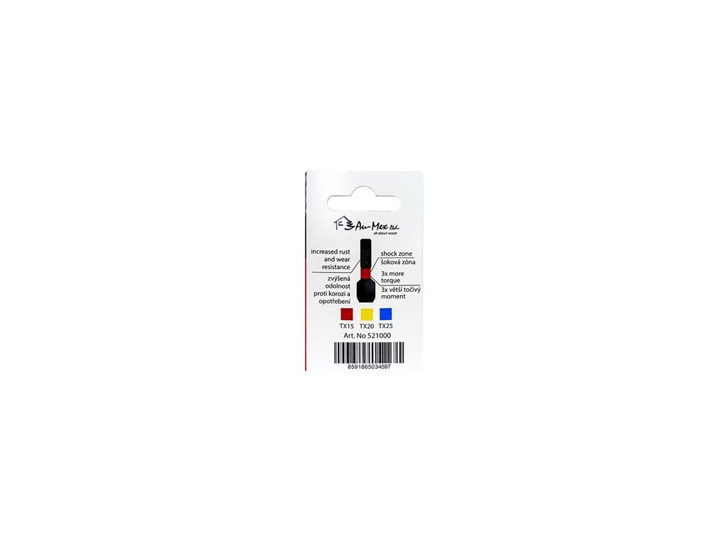 MEX-TOOLS Hobby – IMPAKTNÍ BITY • Torx: TX15 • Délka: 25 mm • Materiál: ocel S2 • Povrchová úprava: Manganové fosfátování + antikorozní povlak • Balení: 2 ks/bal Impaktní bity z řady MEX-TOOLS Hobby jsou praktickým řešením pro domácí dílny a stavební projekty, kde je důležitá spolehlivost, jednoduchost a dostupná cena. Jsou navrženy pro běžné montážní práce, ale díky kvalitní oceli S2 zvládnou i vyšší zatížení. Klíčové vlastnosti a výhody: • Materiál S2 ocel – pevný a odolný základ pro spolehlivé šroubování • Přesné CNC obrábění – přesný Torx profil zajišťuje menší opotřebení a lepší přenos síly • Torzní zóna– snižuje deformaci bitu, zvyšuje točivý moment a prodlužuje životnost • Magnetická fixace – vrut drží pevně na místě, což usnadňuje práci i v hůře přístupných polohách • Povrchová úprava mangan-fosfát + antikorozní vrstva – vyšší odolnost proti korozi a hladší šroubování • Laserové značení velikostí – rychlé a snadné rozpoznání • Barevné kroužky – pro rychlou orientaci mezi jednotlivými bity Materiál a zpracování: Bity MEX-TOOLS Hobby jsou vyrobeny z oceli S2 s tepelně upraveným jádrem (HRC 58–60), což zajišťuje dobrou torzní pevnost a odolnost proti nárazům. Povrchová úprava mangan-fosfát zvyšuje ochranu proti korozi a snižuje tření, takže šroubování je plynulejší a bit má delší životnost.Doplňkové parametry